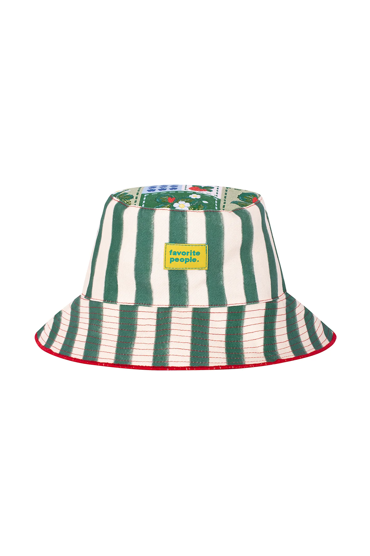 Favorite People solhat i printet fragola fra SS26 kollektionen La Cantina. Solhatten har grønne striber og print med jordbær på toppen. Den giver en god skygge mod solen.